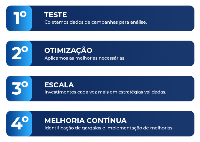 O trafego vem como mais uma engrenagem dentro da sua empresa, na nossa metodologia de teste, otimização, escala e melhoria contínua explicamos que os resultado aparecem quando testamos ao máximo todas as formas de atingir e impactar o potencial cliente.